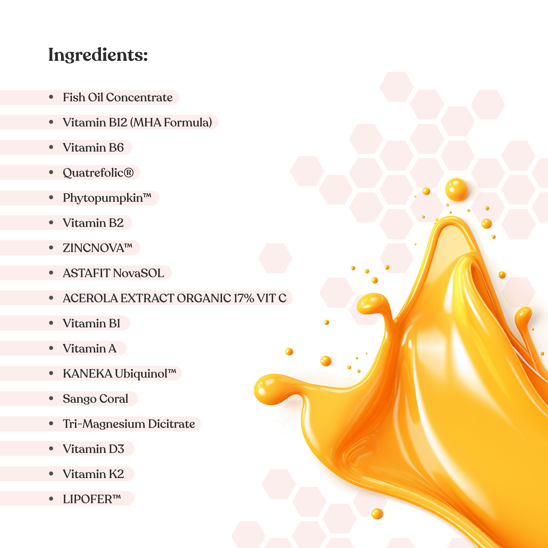 - Long-term mental health and vitality: The combination of B vitamins, especially vitamin B12 (MHA formula) and vitamin B6, helps maintain cognitive abilities and reduce the risk of age-related mental degeneration. Fish oil (Omega-3) promotes brain function, improves memory performance, and provides long-term protection against neurodegenerative diseases.