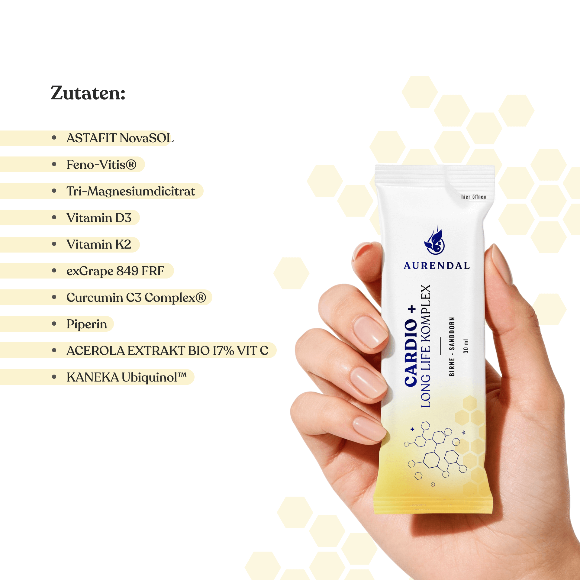 - Cardiovascular health: Ingredients such as Feno-Vitis®, KANEKA Ubiquinol™, and Curcumin C3 Complex® reduce the risk of heart attacks and strokes. These ingredients improve blood circulation, lower blood pressure and prevent vasoconstriction.